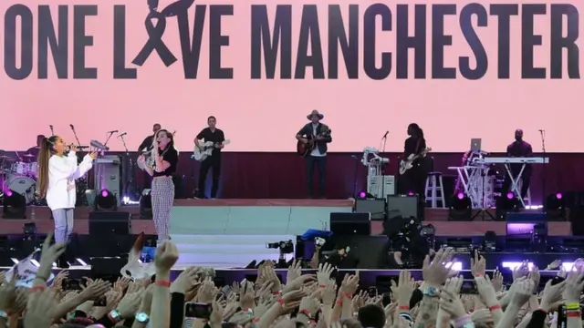 المغنية الأمريكية أريانا غراندي تحيي حفلا خيريا لصالح أقارب ضحايا هجوم مانشستر الذي أدى إلى مقتل 22 شخصا في مايو/أيار الماضي.