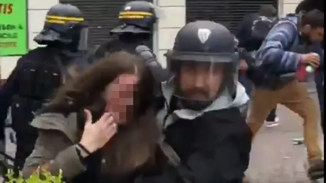 ويظهر الفيديو الأصلي، الذي نشره الطالب طه بوحافظ البالغ من العمر 21 عاما على وسائل التواصل الاجتماعي، رجلا يرتدي خوذة الشرطة وزيّا لا يمت بصلة لزي شرطة مكافحة الشغب الفرنسية انضم إليهم بعد اندلاع اشتباكات.