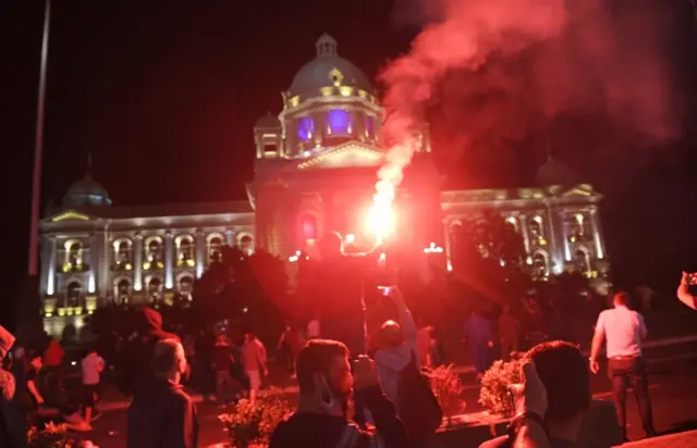 وقد أُلقي اللوم على القوميين المنتمين إلى أقصى اليمين في إثارة الاضطرابات واقتحام مبنى البرلمان. وقالت وسائل إعلام صربية إن من بين المحتجين عضواً في الجمعية كان قد روَّج لنظريات المؤامرة المناهضة لإيجاد لقاح للمرض و لشبكات الجيل الخامس للهواتف الخلوية.