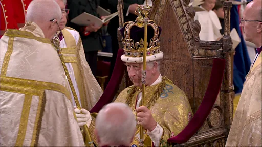 وما أن وضع رئيس أساقفة كانتربيري تاج سانت إدوارد على رأس الملك حتى سمعت هتافات "حفظ الله الملك" داخل كنيسة دير وستمنستر وخارجها.