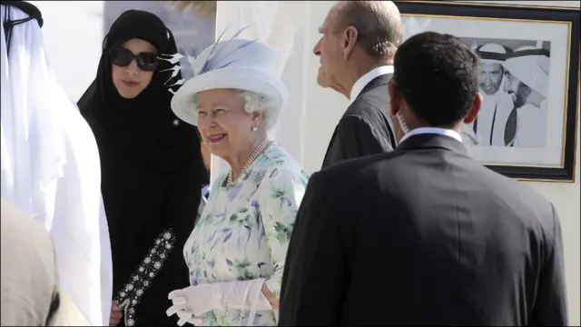 التعليق على الصورة، قامت ملكة بريطانيا اليزابيث وزوجها الأمير فيليب بجولة شملت الإمارات العربية المتحدة وسلطنة عمان.