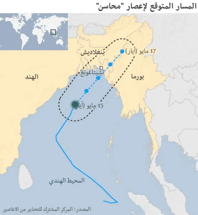 وفي بورما، يخشى عشرات الآلاف من مسلمي الروهينغيا المقيمين في مخيمات بمناطقة منخفضة بولاية راكين من وصول الإعصار إليهم.