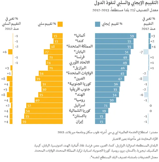وقد طلب من هؤلاء تصنيف 16 دولة، والاتحاد الأوربي، من حيث تأثيرها جميعا في العالم، وهل كان ذلك التأثير أساسا "إيجابيا" أم "سلبيا".