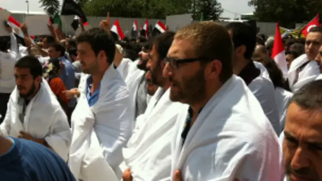 وتشاهد أعداد ضئيلة من الشباب يحملون أكفان الشهادة، في إشارة إلى المدى الذي يعتزمون الوصول إليه لإعادة رئيس الاخوان المسلمين المنتخب إلى السلطة.