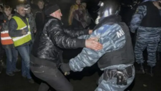 ووقعت الاشتباكات الاخيرة قبالة محكمة في كييف حيث تجمعت اعداد غفيرة لسماع الحكم في محاكمة اعضاء منظمة يمينية متشددة.