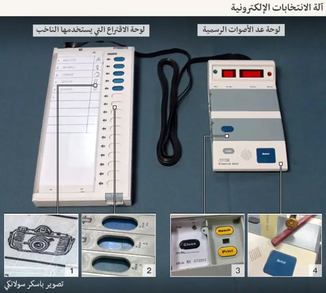 3) تحتفظ وحدة التحكم بأصوات الناخبين وتعمل ببطارية حتى يمكن ضمان استمرارعملها في حال انقطاع التيار الكهربي. وخلال عملية الفرز، يظهر الرقم التسلسلي لكل مرشح بالإضافة إلى إجمالي عدد الأصوات التي أدلي بها.
