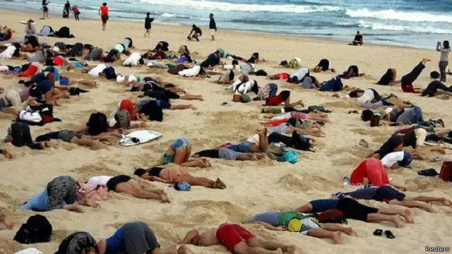 دفن أكثر من مئتي متظاهر رؤوسهم في الرمال على شاطئ بوندي في استراليا، احتجاجا على ضعف التحرك الدولي إزاء قضية التغير المناخي.