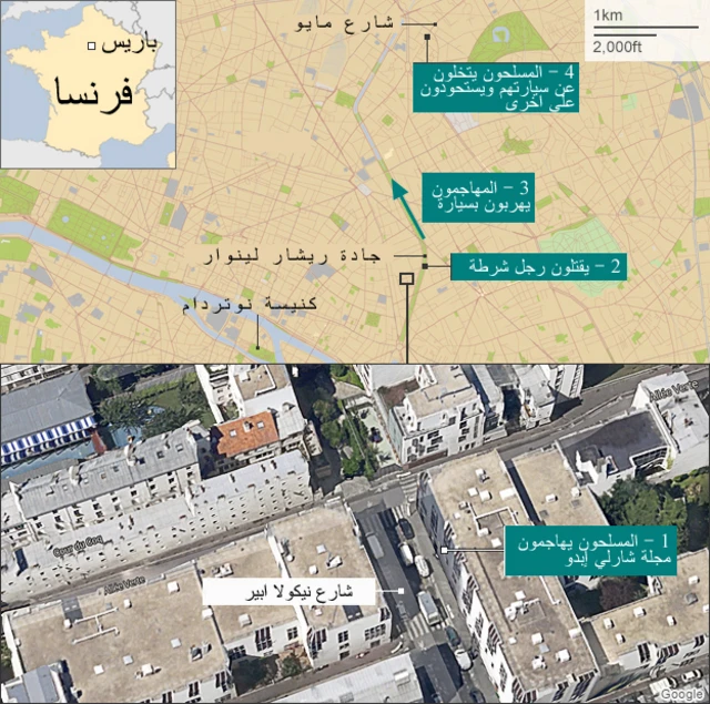 فيما قامت شرطة مكافحة الارهاب بغارة في مدينة رايمز شمال شرقي فرنسا لتعقب المهاجمين.