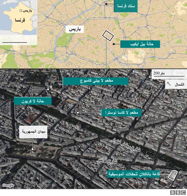 و<link type="page"><caption> شملت الهجمات</caption><url href="http://www.bbc.com/arabic/worldnews/2015/11/151113_paris_shootings_explosions_live" platform="highweb"/></link> حانات، ومطاعم، وقاعة حفلات، وملعب شهير لكرة القدم.