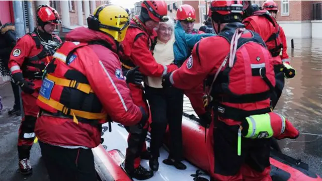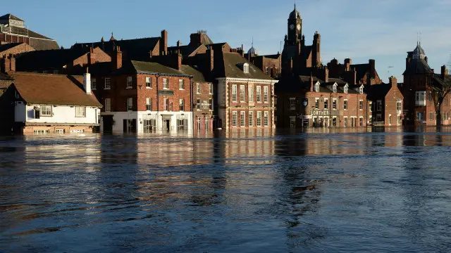 وتخلي فرق الإنقاذ المنازل في يورك التي يرتفع منسوب مياه الفيضانات فيها ويعيش آلاف الأشخاص في شمال غربي انجلترا بلا كهرباء.