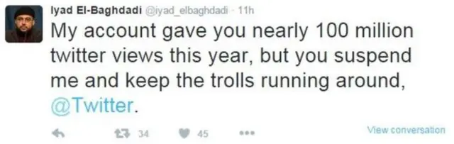وقال البغدادي لبي بي سي إنه تلقى رسالة من توتير مفادها بأنه "انتهك" قواعد تويتر لكنها لم تذكر طبيعة هذه المخالفة.