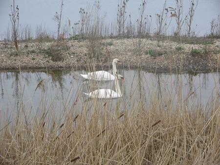 swans at Dungeness Nature Reserve on holiday with family , saw these 2 swans at Dungeness Nature Reserve, had 2 take photo quickly as children where coming up the path in a fit of excitment to see them. I was very pleased with the shot that i got in the amount of time i had the until kids would come into shot . The scene was so tranquil and relaxed it felt allmost angelic so i call this picture the calm before the storm.