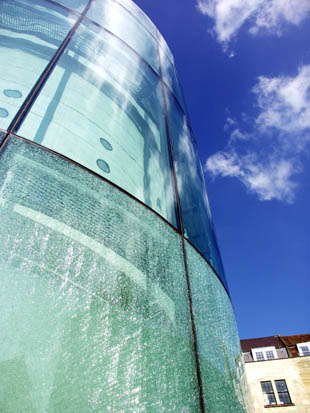Thermae Bath Spa; unfinished. This is a project for a Spa using Bath's natural hot springs, which has been ongoing for several years. I like the way the stark modern architecture contrasts sharply with the soft golden yellow stone of the Georgian buildings which surround it, & the crazed effect of the smashed glass at the bottom of the building.