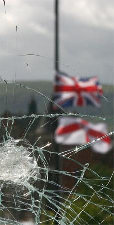Intimidation This was taken from my girlfriend's appartment window on Sandy Row, Belfast. Every window in the appartment had been broken by locals trying to intimidate the residents out of the building. It paints a sad but representative picture of Belfast's past and present.