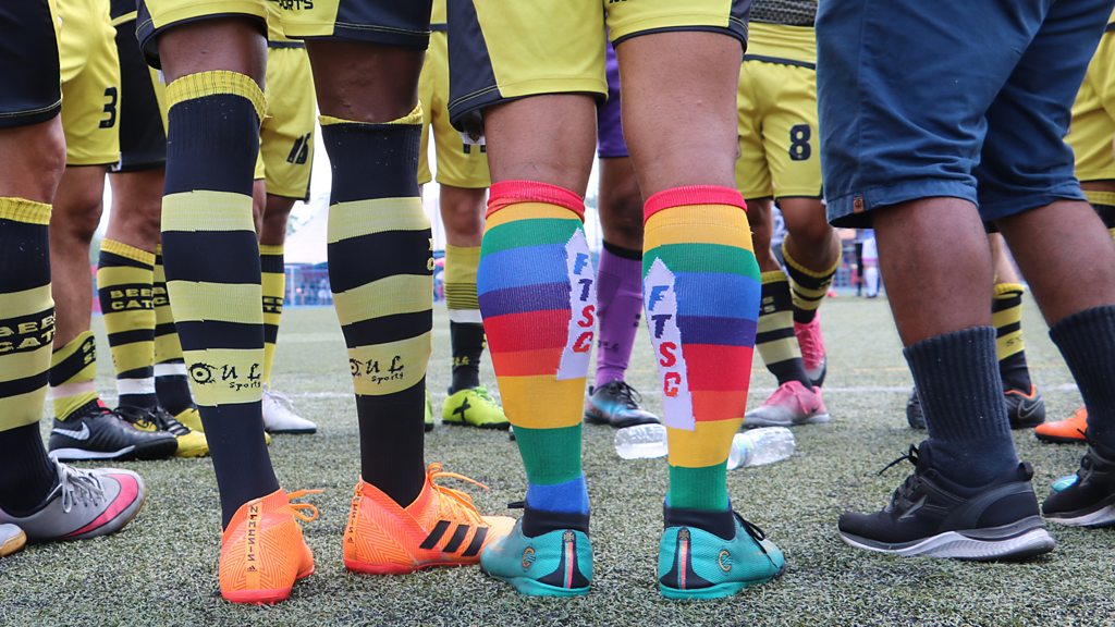 (Image: Footballer’s legs with rainbow socks. Credit: BBC)