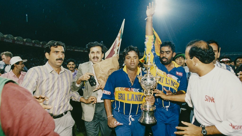 PHOTO: Arjuna Ranatunga and Asanka Gurusinha with the Cricket World Cup trophy after Sri Lanka beat Australia in the final, Lahore, 17th March 1996. (Photo by Ross Kinnaird/Getty Images)