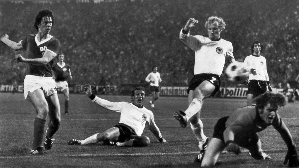PHOTO: East German forward Juergen Sparwasser (L) scores the winning goal in 1974 (Getty Images)