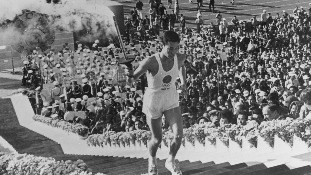 PHOTO: Japanese student Yoshinori Sakai about to light the Olympic Cauldron in October 1964 (Keystone/Getty Images)