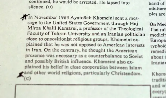 Xomeyninin bu məktubu, ABŞ hökumətinin, üzərindəki məxfilik yenicə qaldırılmış sənədlərinin arasından çıxıb. Buradakı diplomatik teletayplar, siyasət memorandumları, görüş protokolları Amerika və Xomeyni arasındakı məxfi münasibətlərin tarixini açır.