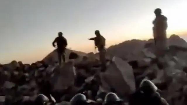 Rəqibin döyüş mövqelərini yenicə ələ keçirmiş şəxslər səhər şəfəqlərinin işıqlandırdığı təpədə üzərlərinə silah yönəltdikləri bir neçə hərbçini bir yerə toplayaraq əllərini qaldırmış şəkildə yerə oturmağa məcbur edirlər.