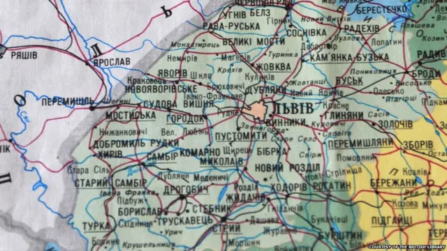 Yuxarıdakı xəritədə o, mərkəzdə narıncı rənglə göstərilib və Rus Kiril əlifbası ilə yazılıb. Bura Sovet Ukraynasının bir hissəsi olaraq qalmışdı və ruslaşdırılmış versiya ilə Lvov kimi tanınırdı. SSRİ dağılandan sonra onun adı yenidən Lviv olub.