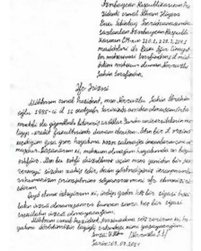 "Mən bu səhvi düzəltmək üçün yenidən bir şans verməyi sizdən xahiş edir, daim göstərdiyiniz insanpərvərlik və humanizm prinsirlərinə söykənərək məni əfv etmənizi rica edirəm".