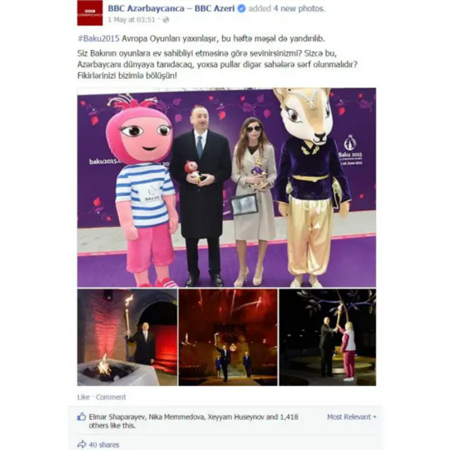 "Bakının oyunlara ev sahibliyi etməsinə görə sevinirsinizmi? Sizcə bu, Azərbaycanı dünyaya tanıdacaq, yoxsa pullar digər sahələrə sərf olunmalıdır?" - BBC Azərbaycancanın bu suallarını yüzlərlə Facebook istifadəçisi cavablandırıb.