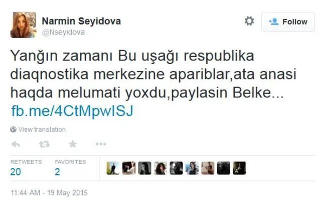 @Nseyidova adlı istifadəçi Twitter və Facebook-da bu elanı paylaşıb: "Yanğın zamanı bu uşağı respublika diaqnostika mərkezinə aparıblar, ata anası haqda melumatı yoxdu, paylaşın..."