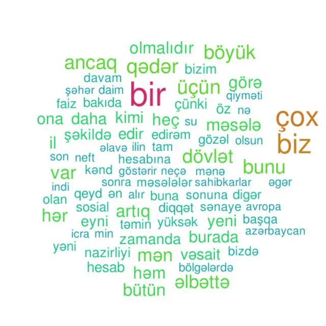 Prezident Əliyevin çıxışı zamanı daha çox istifadə etdiyi sözlər daha böyük şriftlə göstərilir: