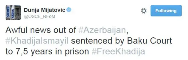 ATƏT-in Media Azadlığı üzrə nümayəndəsi Dunja Mijatovic bu qərarı "dəhşətli xəbər" adlandırıb.