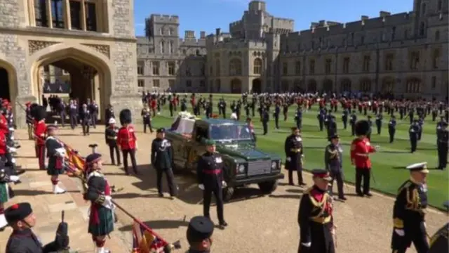 Hərbi orkestr Hersoqun seçdiyi musiqini ifa edərkən əsgərlər boyun əyib və cənazəni gətirmək üçün istifadə olunan Land Rover əraziyə daxil olub.