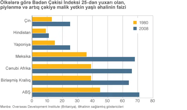 1980-ci ildən 2008-ci ilə qədər artıq çəkisi olan və ya piylənmiş yetkinlərin sayı dünyada 23 faizdən 34 faizə qalxıb. Bu o deməkdir ki, onların <link type="page"><caption> bədən çəkisi indeksi</caption><url href="http://www.bbc.co.uk/azeri/azerbaijan/2012/12/121214_fat_index.shtml" platform="highweb"/></link> 25-dən çoxdur.