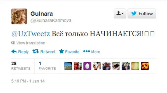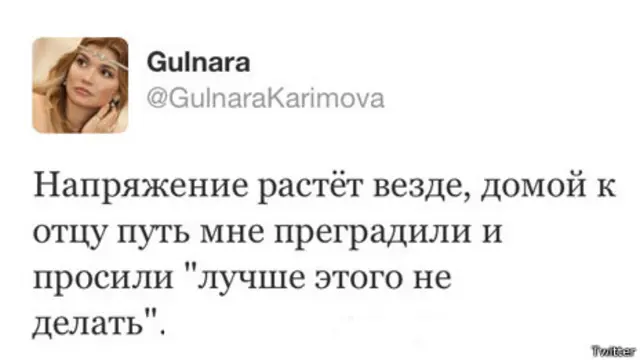 Onun mesajları çox vaxtı ikimənalı və müəmma ilə dolu olsa da, Twitter səhifəsi Özbəkistanın qəribə siyasətinə az olsa da işıq salır. Daha əvvəl yoqa və moda haqqında olan tweetlərinin tonu dəyişib: xanım Kərimova anasını və bacısını cadugərlikdə, atasının rəsmilərini isə repressiya və pozuntularda ittiham edib.