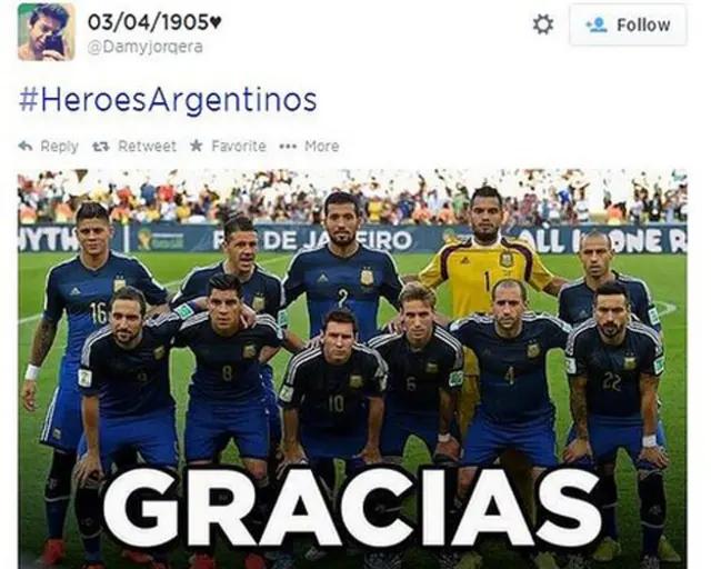 Məyusluqlarına baxmayaraq sadiqliklərini və təşəkkürlərini bildirmək Argentina azarkeşlərinin yadından çıxmayıb. Oyun bitəndən sonra #HeroesArgentinos (#ArgentinanınQəhrəmanları) və #ArgentinaCampeonBrasil2014 (#ArgentinaBraziliya2014Çempionları) bütün dünyada trending siyahısına düşüb.
