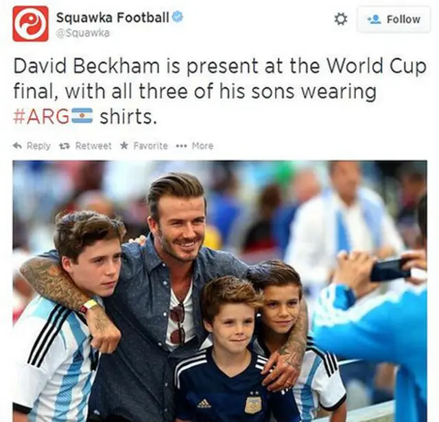 İngiltərə millisinin ulduzu David Beckham həm Almaniyada, həm də Argentinada trendlərə düşüb. Səbəb odur ki, oğulları Maracana stadionuna Argentina köynəklərində gəlmişdilər. Azarkeşlər sevimli oyunçularının Argentinanı dəstəkləməsinə görə şad idilər - "Los Beckham" (Beckhamlar) ifadəsi Twitterdə 29 000-dən çox dəfə istifadə olunmuşdu.