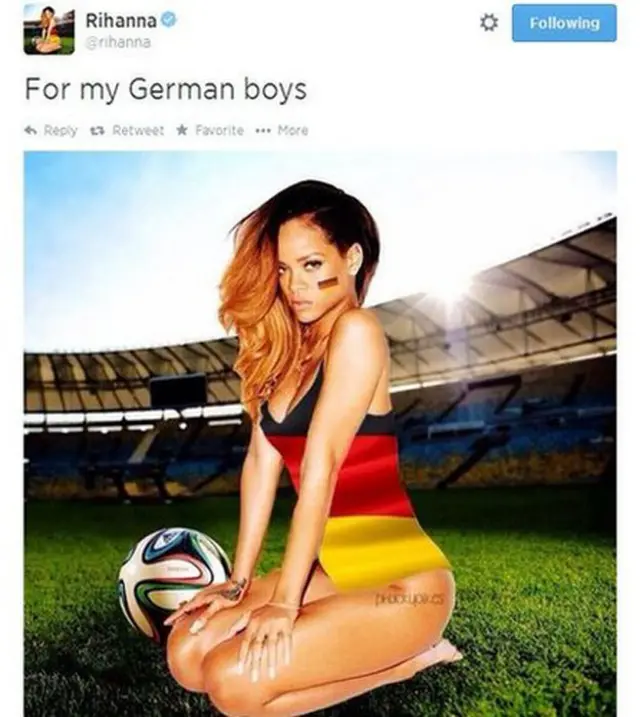 O, həmçinin Almaniyaya azarkeşlik edən müğənni Rihannaya təşəkkürlərini bildirmək üçün tweet yazıb. Rihanna çempionat barədə Twitterdə çox fəal olub və finalın keçirildiyi Maracana stadionundan bir neçə foto paylaşıb.