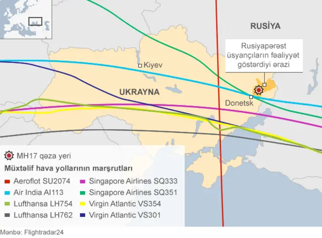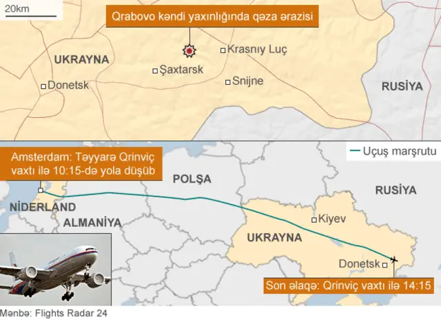 Göyərtəsində 298 adam olan Malayziya Hava Yollarının Boeing-777 təyyarəsi çərşənbə axşamı Rusiya sərhədinin yaxınlığındakı münaqişəli ərazidə qəzaya uğrayıb. Qəzadan sağ çıxan olmayıb.