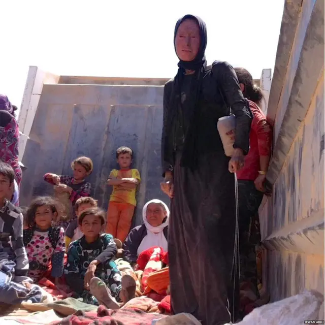 "Ailəmlə birlikdə dağlarda 12 kilometr yol gəlmişəm. Uşaqlarım susuzluq və ishaldan əziyyət çəkir. Qohumlarımın hamısını itirmişik”, - bacılardan biri deyib. Bu arada 65 yaşlı qaçqın Farman Jendi (sağda) baş verənləri "siyasi və iqtisadi yox, dini müharibə” kimi dəyərləndirir.