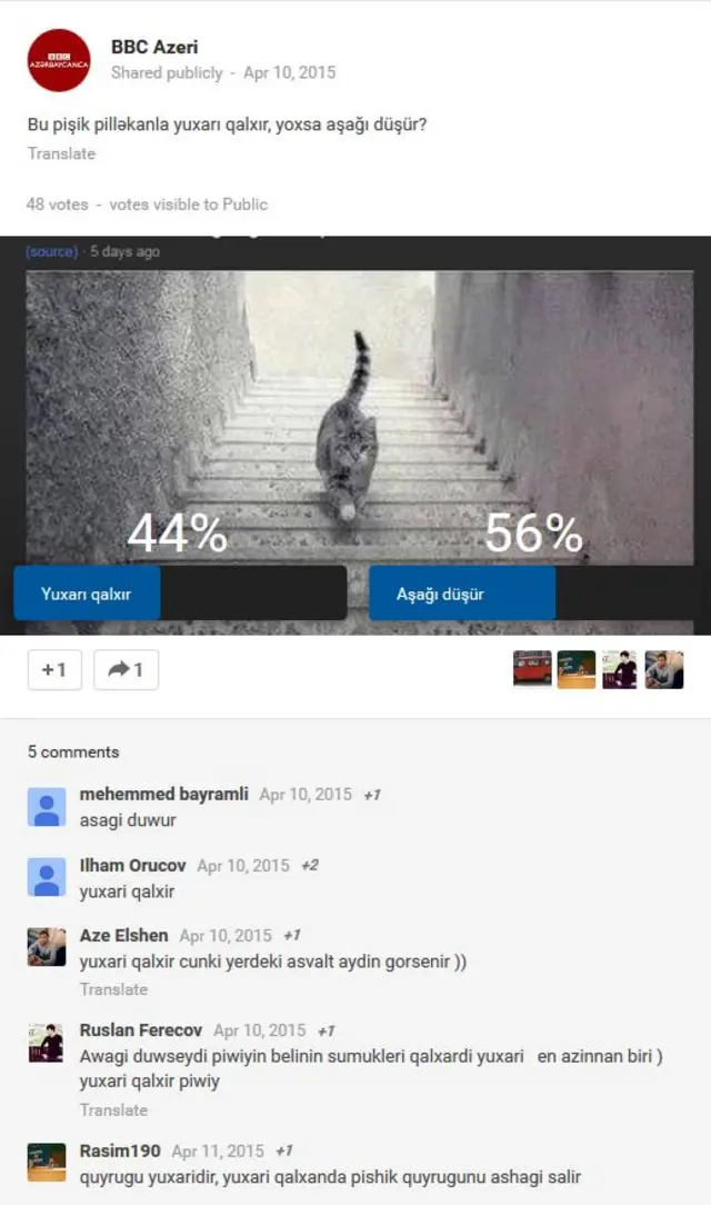 BBC Azərbaycancanın <link type="page"><caption> Google+ səhifəsindəki</caption><url href="https://plus.google.com/+bbcazeri" platform="highweb"/></link> sorğuda iştirak edənlərin əksəriyyəti deyib ki, pişik aşağı düşür: