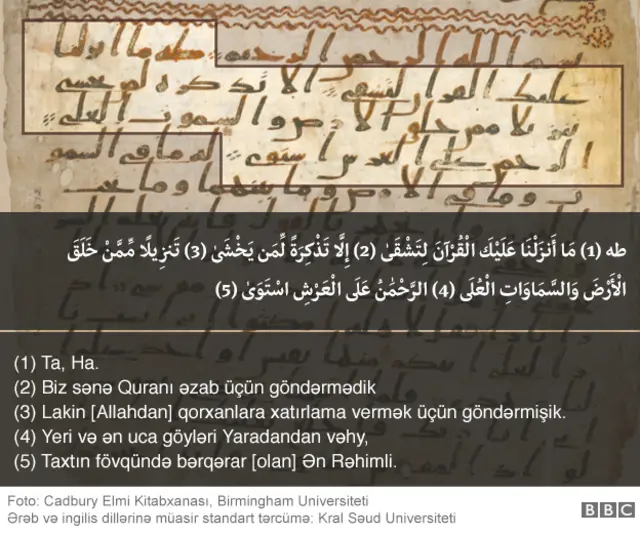 Universitet araşdırmaçılarının apardığı radiokarbon analizi göstərib ki, əlyazmaların ən azı 1370 yaşı var, bu isə, Quranın indiyə qədər tapılmış ən qədim nüsxəsidir.