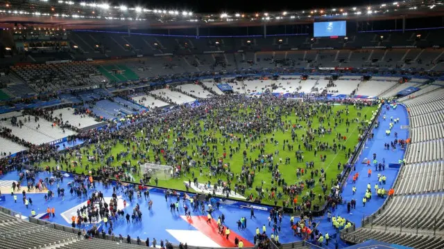 Məlumatlara görə, oyunu izləyən Fransa prezidenti təhlükəsiz yerə təxliyə edilib. Hücumlarla bağlı Hollande təcili müşavirə çağırıb.