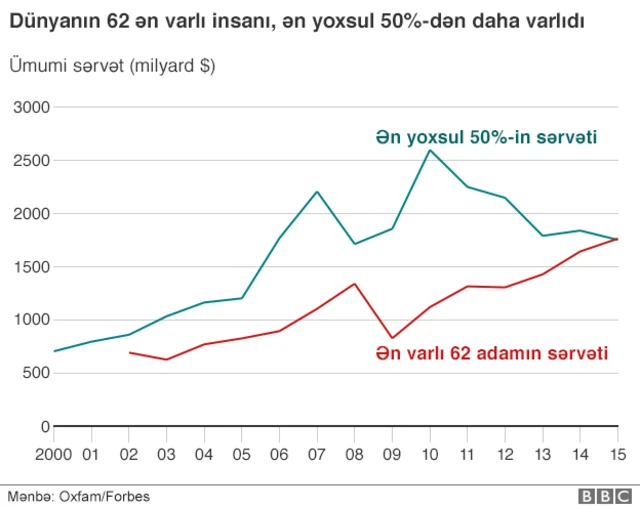 Oxfam habelə hesablayıb ki, dünyanlın ən varlı 62 sakini qlobal əhalinin ən yoxsul yarısının malik olduğu qədər sərvət sahibidir.