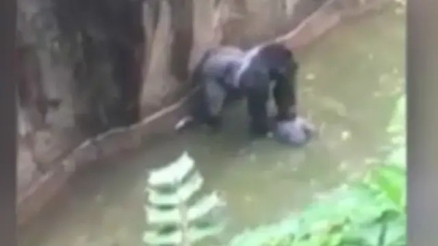 17 yaşı və 180 kilo çəkisi olan erkək qorilla Harambe uşağı özünə çəkərək volyerdəki dayaz hövzədə onu sürüməyə başlayıb.