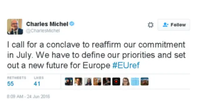 "Əsəbi reaksiyaların vaxtı deyil. Bu gün 27 liderin adından demək istəyirəm ki, biz birliyimizi 27 olaraq saxlamaq istəyirik. Britaniya rəsmi olaraq Aİ-ni tərk edənədək Britaniyada Aİ qanunları tətbiq ediləcək və mən demək istəyirəm ki, bura vəzifələr də aiddir.”