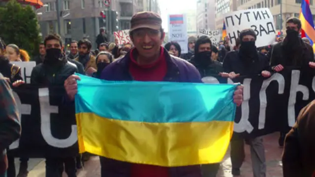 Yerevan küçələrinə etiraza çıxan fəalların əllərində "Putin go home", "Avro Ermənistan", "Öz ölkəmizin ağası özümüzük" və "No to the USSR" şüarları yazılmış plakatlar var.