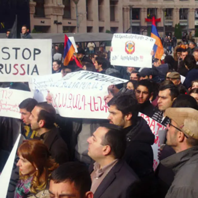 Rusiya prezidentinin Ermənistan səfəri ölkənin Gömrük İttifaqına daxil olmasına qarşı etiraz aksiyaları ilə qarşılanıb.