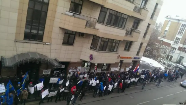 Rusiyanın Su-24 təyyarəsinin Suriya sərhədi yaxınlığında vurulması ilə bağlı Türkiyənin Moskvadakı diplomatik missiyasının qarşısına toplaşan yüzlərlə aksiya iştirakçısı səfirlik binasına yumurta, daş, butulka və boya qutuları atıblar, hadisə yerindən BBC müxbiri Oleq Boldırev xəbər verir.