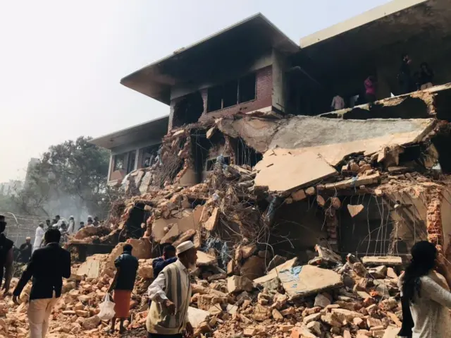 উত্তেজিত জনতা মালামাল লুটপাটের পাশাপাশি ভেঙে ফেলা ভবনটিতে আগুন ধরিয়ে দেয়।