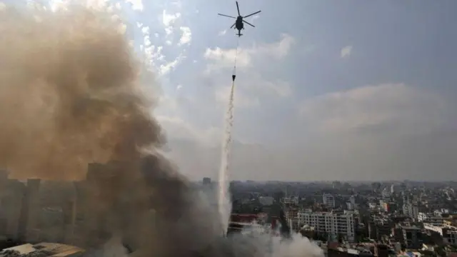 বাংলাদেশের রাজধানী ঢাকার বঙ্গবাজারে আগুন লাগার একদিন পরেও ধোঁয়া উড়ছে আগুনে পুড়ে মাটিতে মিশে যাওয়া ধ্বংসস্তূপ থেকে। পাশাপাশি বুধবার দুপুরে আগুন ও ধোঁয়া দেখা গেছে পাশের বহুতল ভবনেও।