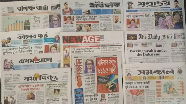 'ICT issues arrest warrants for Hasina, 10 others' নিউ এইজ পত্রিকার প্রথম পাতার এ শিরোনামের অর্থ 'শেখ হাসিনাসহ আরও দশজনের বিরুদ্ধে গ্রেপ্তারি পরোয়ানা জারি করেছে আন্তর্জাতিক অপরাধ ট্রাইব্যুনাল।